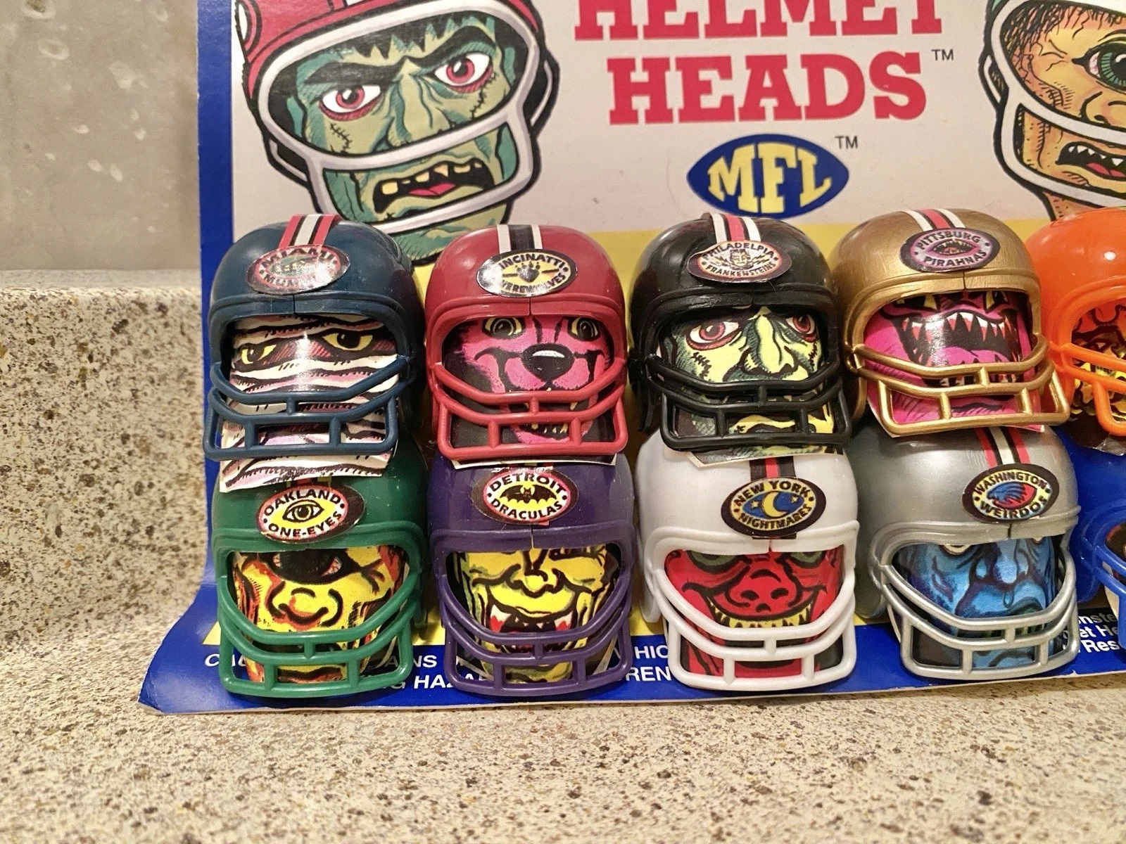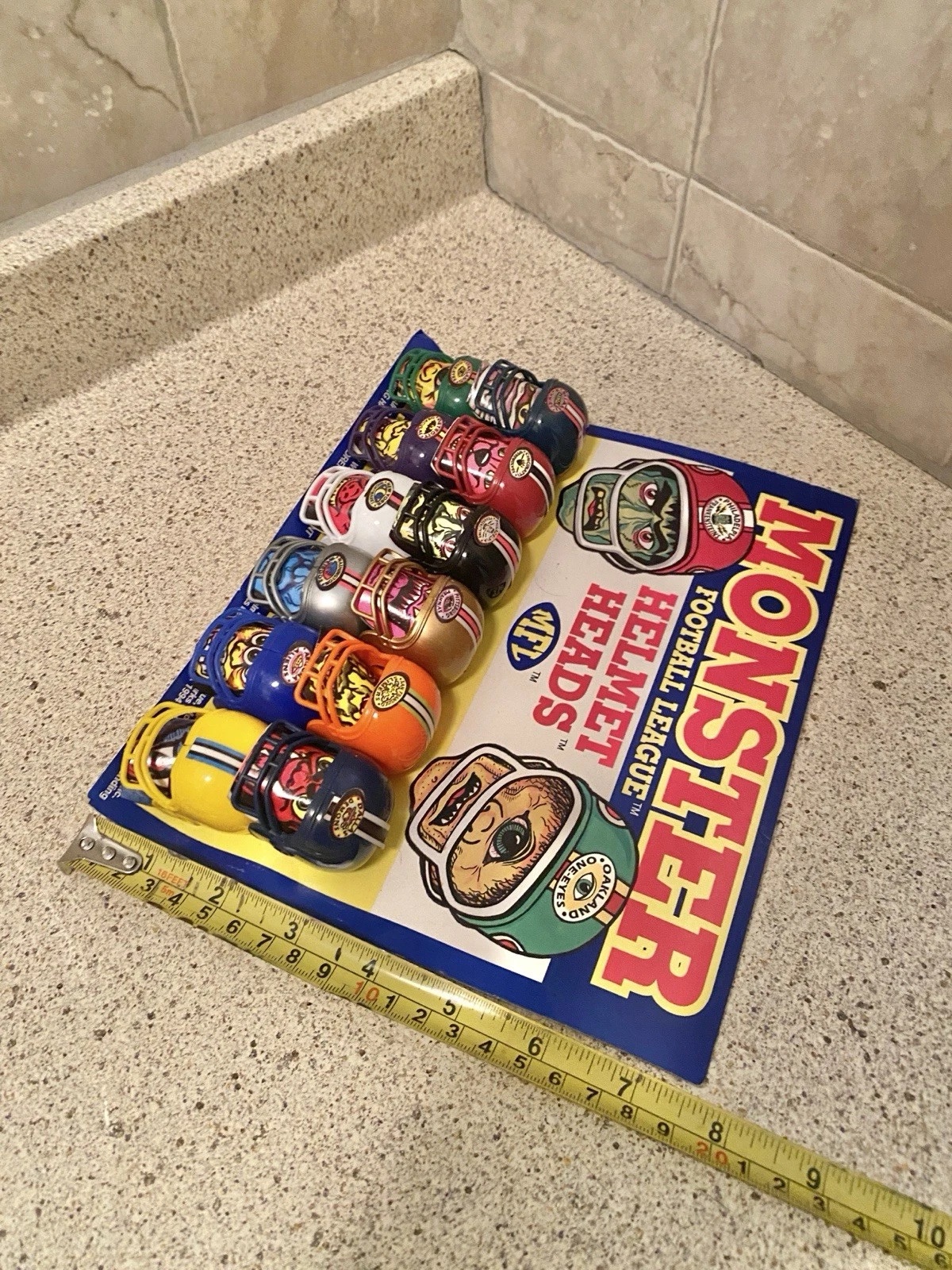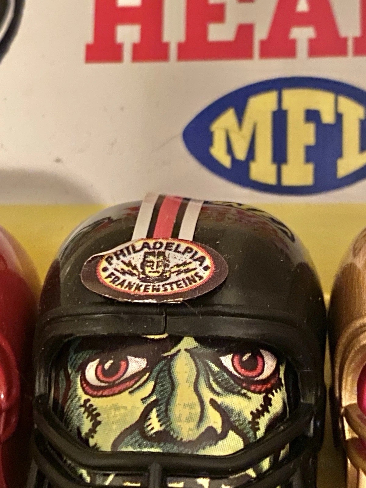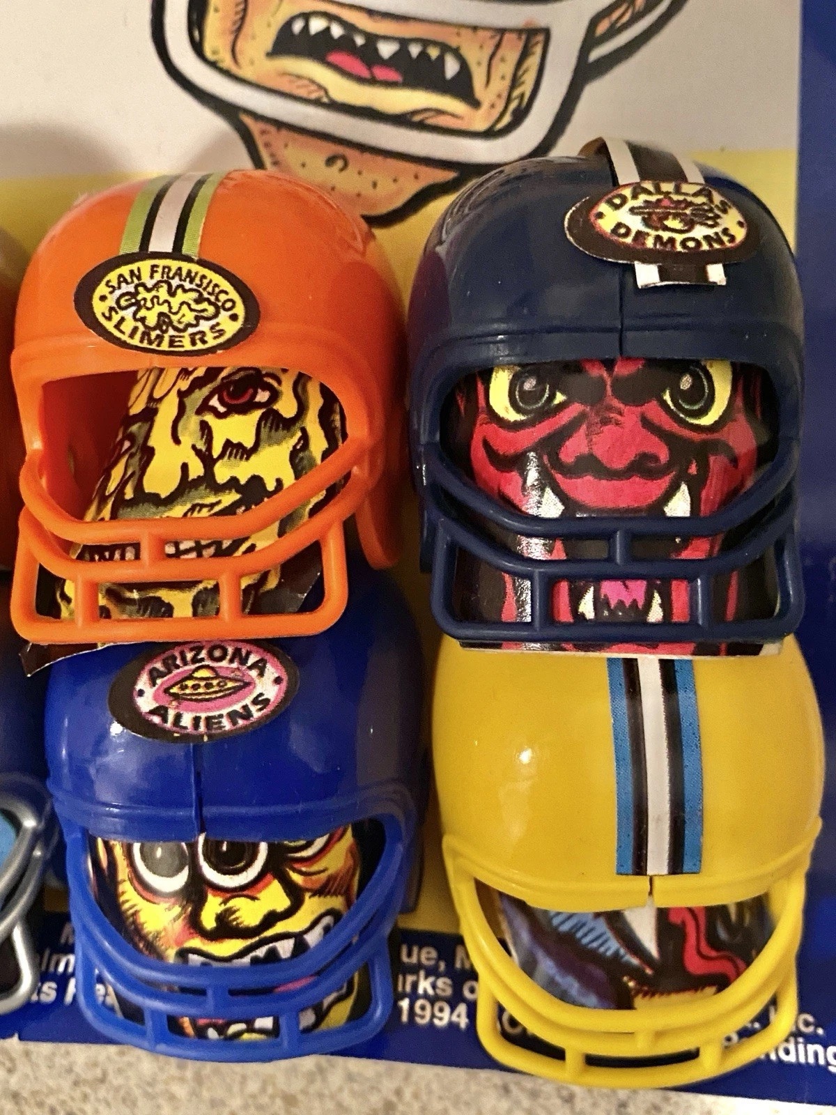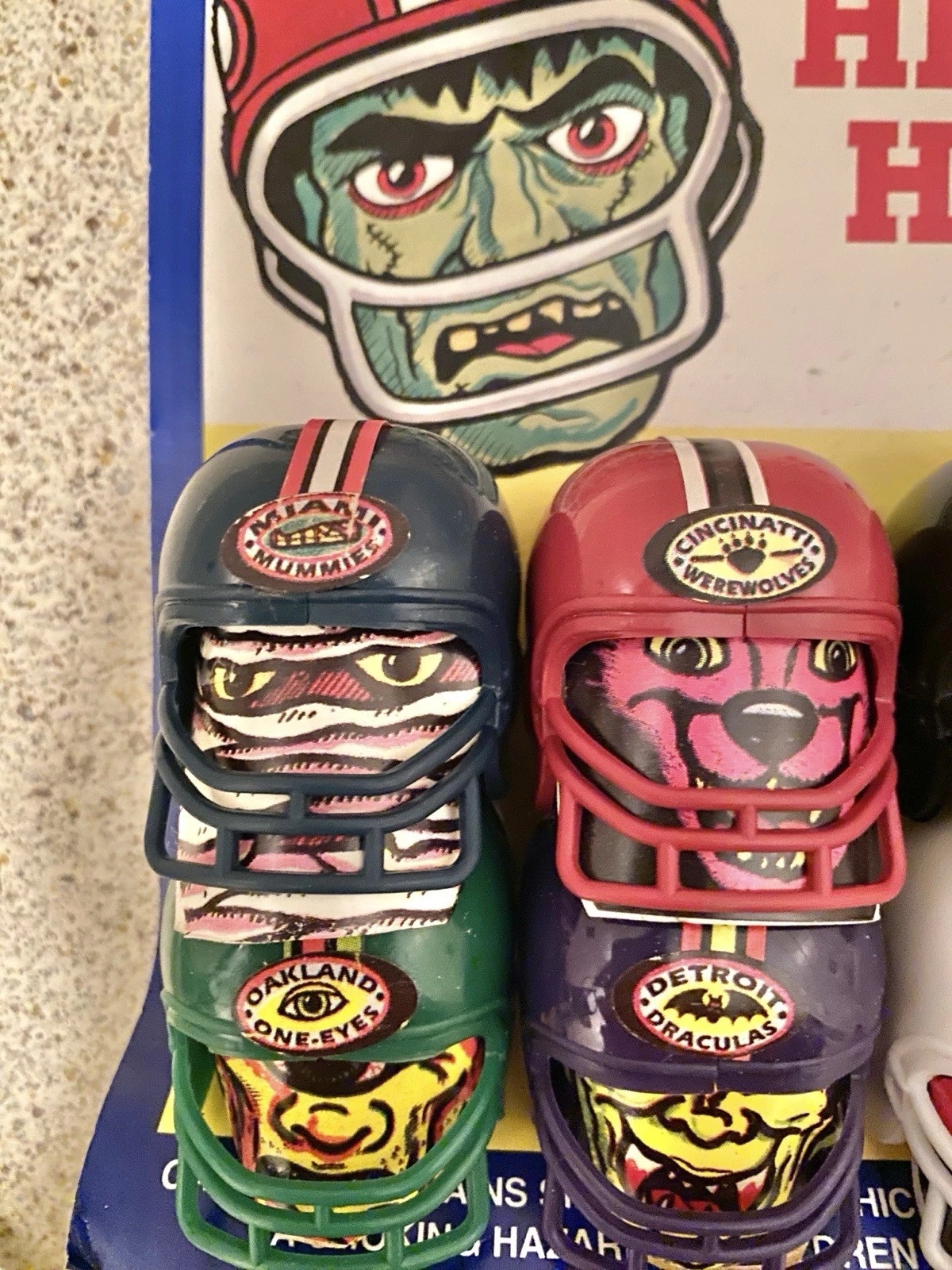 Apparently these were available in gumball machines at some point. Along with the helmets were stickers for teams in a fictional Monster Football League. In addition to the standard side logos and center stripes were faces to be cut out and put inside the helmets. The lot included whole unpeeled sticker blocks for 8 different teams: Oakland One-eyes, Philadelphia Frankensteins, Dallas Demons, Washington Weirdos, Seattle Snakes, Miami Mummies, Pittsburgh Pirahnas [sic], and San Francisco Slimers. Scan of the stickers is first attachment.