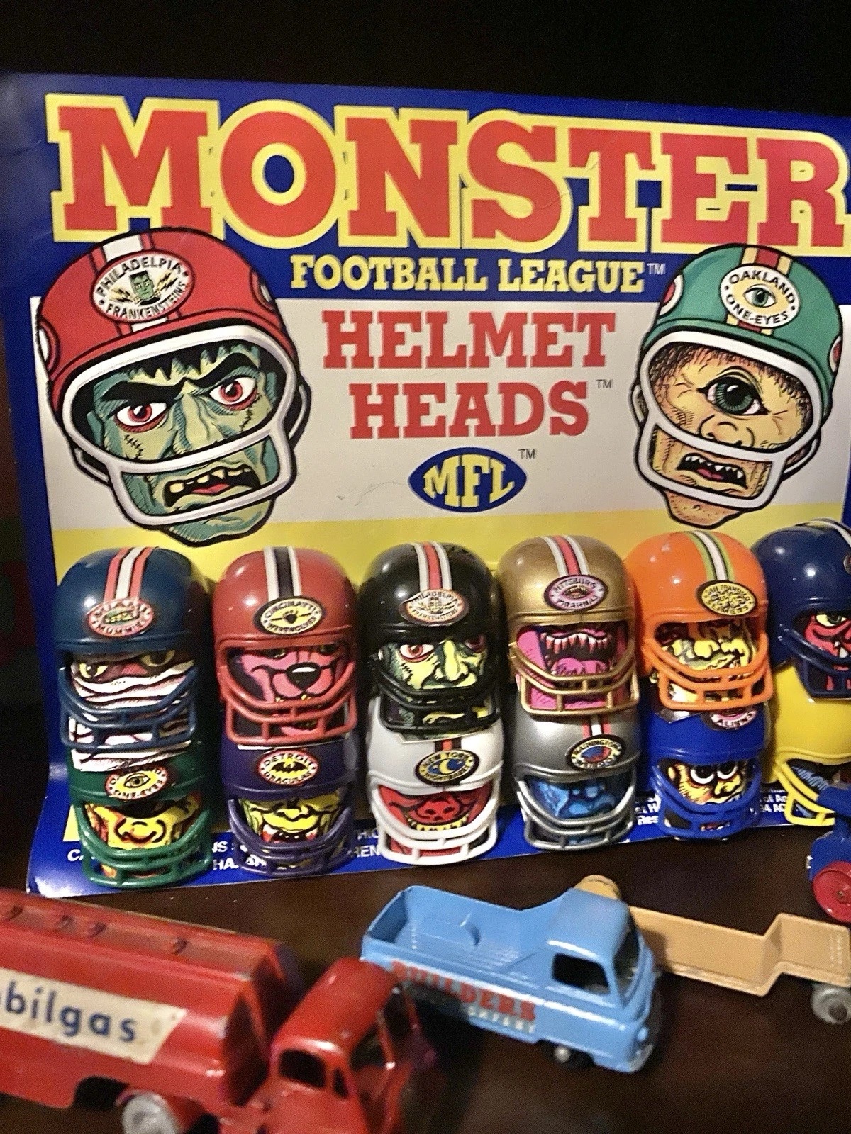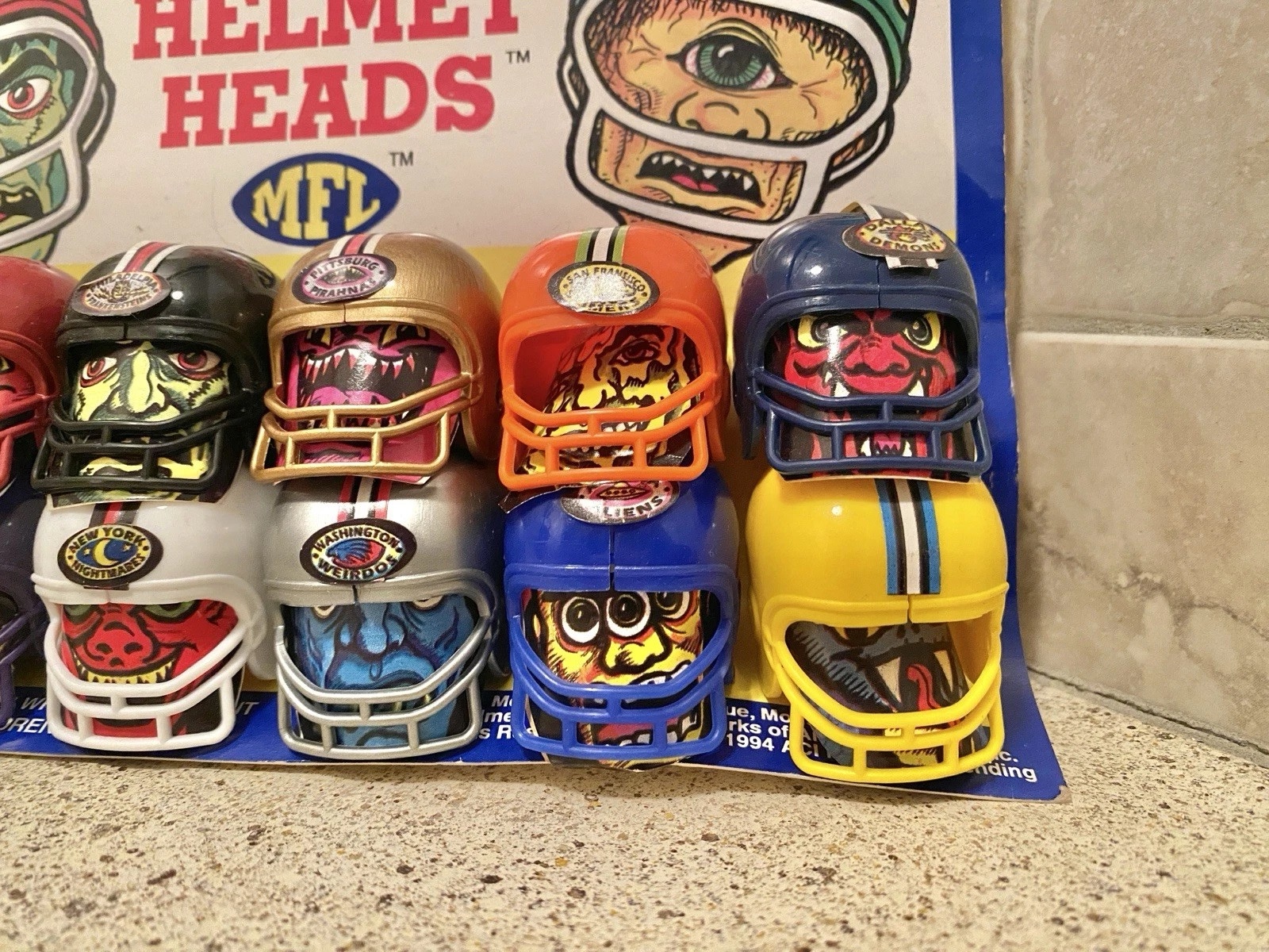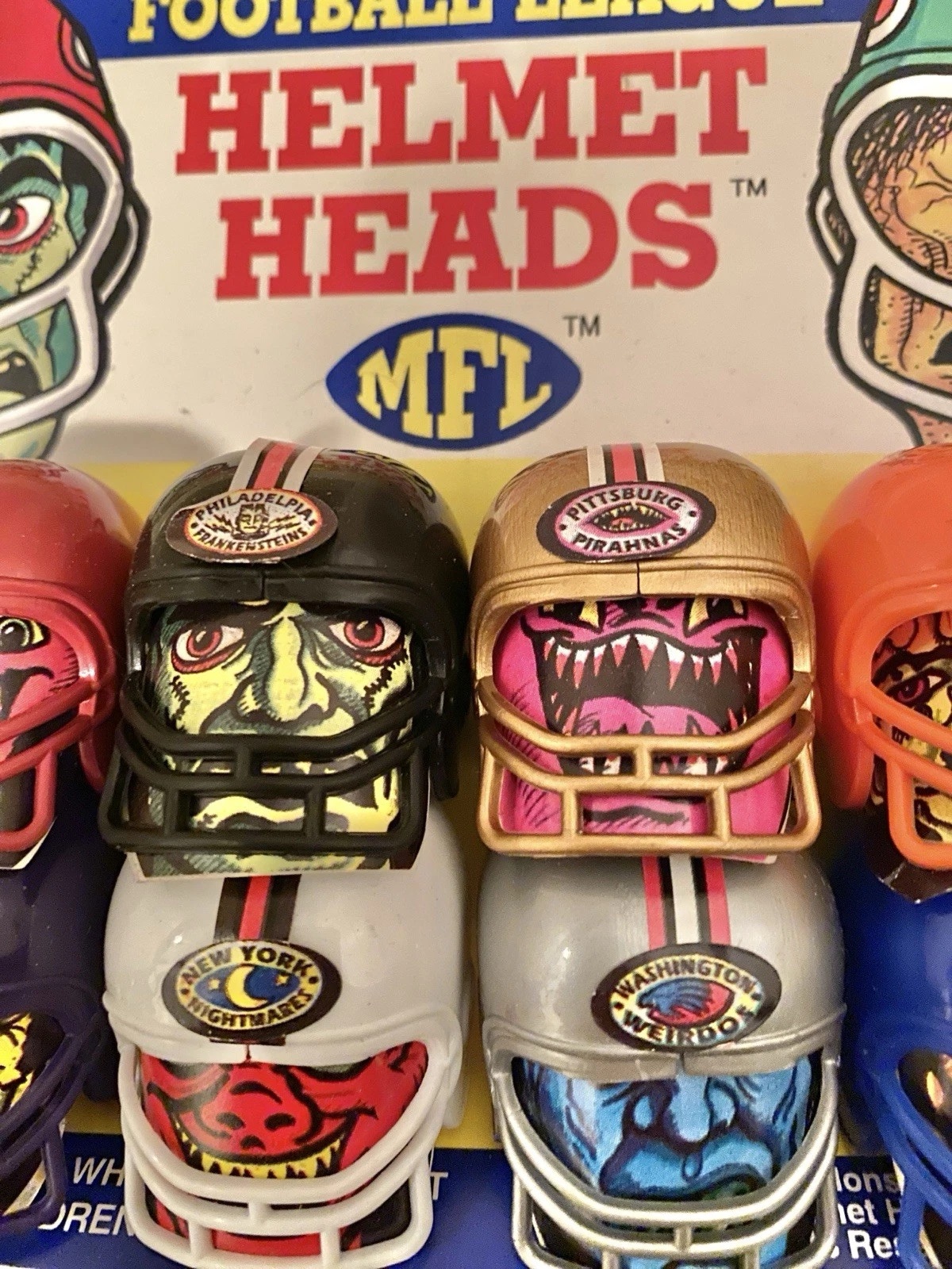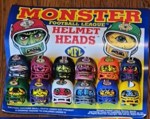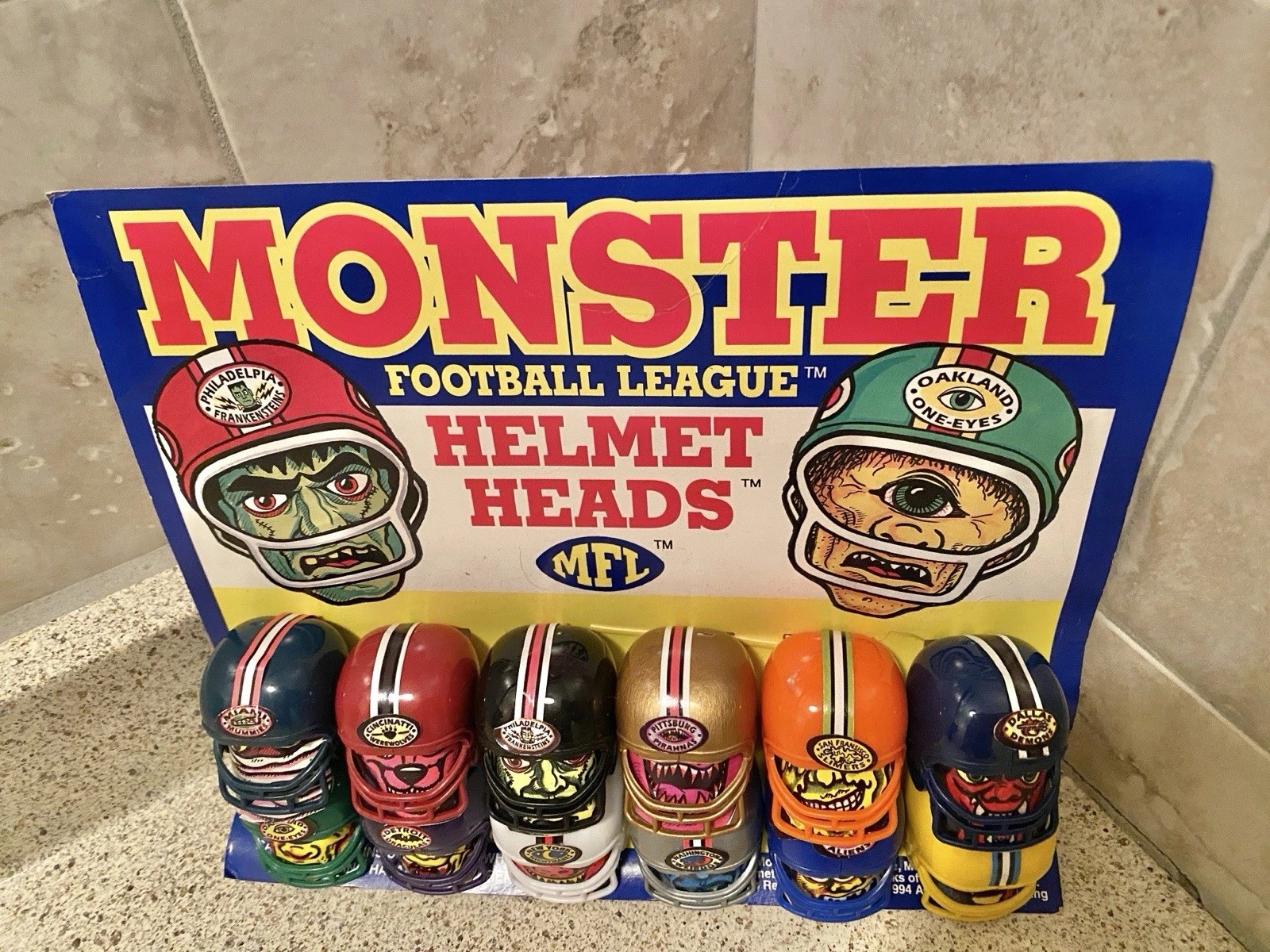 Apparently these were available in gumball machines at some point. Along with the helmets were stickers for teams in a fictional Monster Football League. In addition to the standard side logos and center stripes were faces to be cut out and put inside the helmets. The lot included whole unpeeled sticker blocks for 8 different teams: Oakland One-eyes, Philadelphia Frankensteins, Dallas Demons, Washington Weirdos, Seattle Snakes, Miami Mummies, Pittsburgh Pirahnas [sic], and San Francisco Slimers. Scan of the stickers is first attachment.