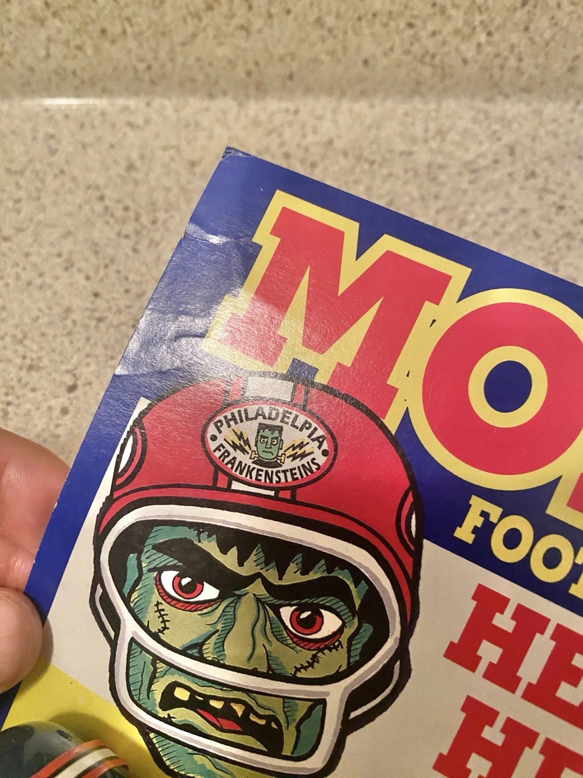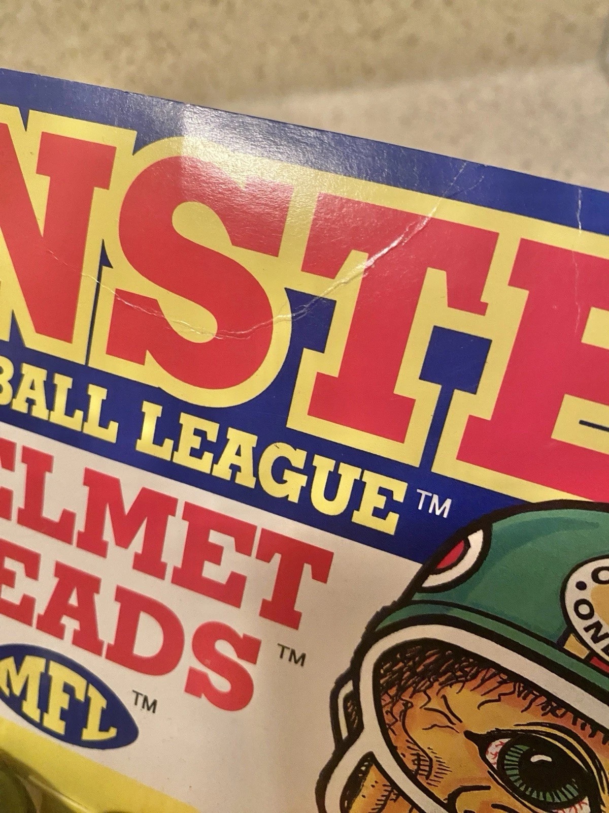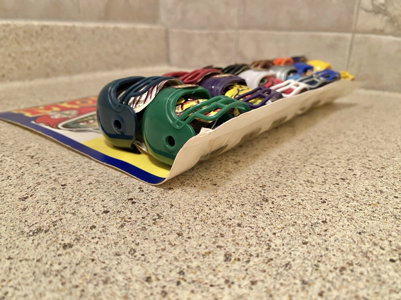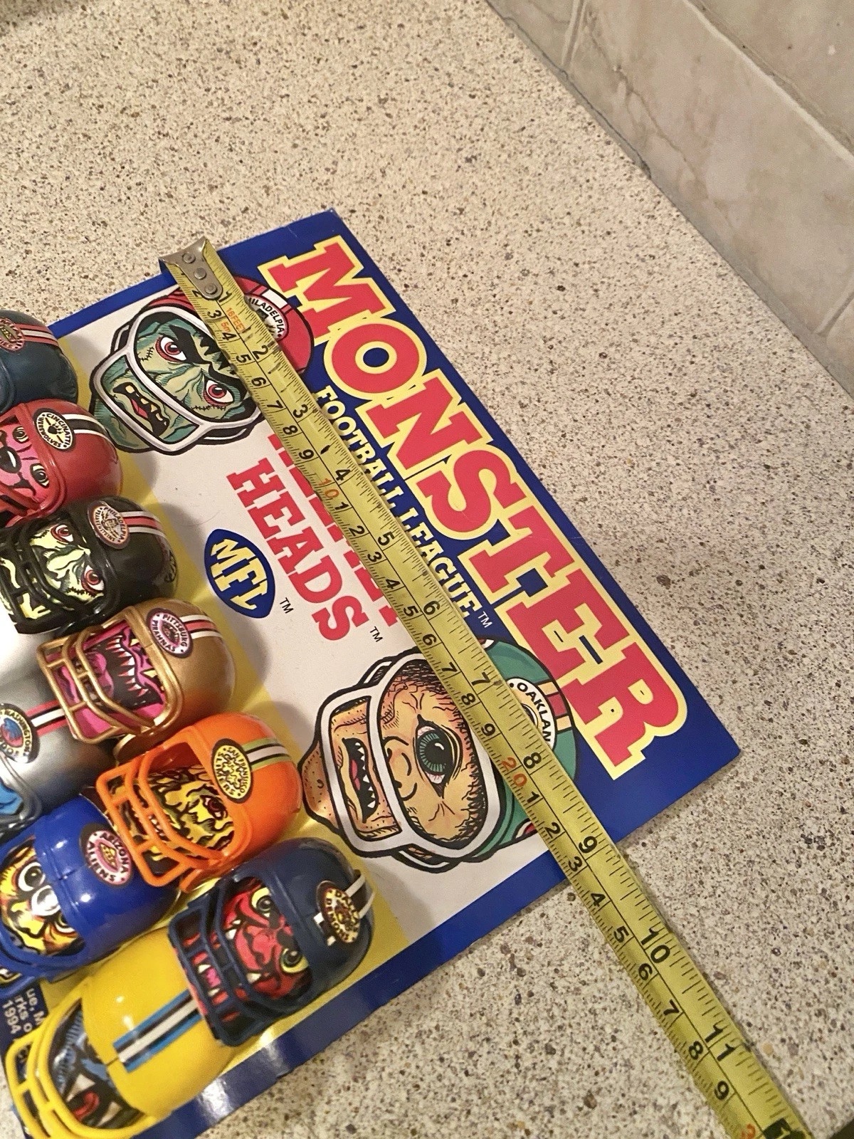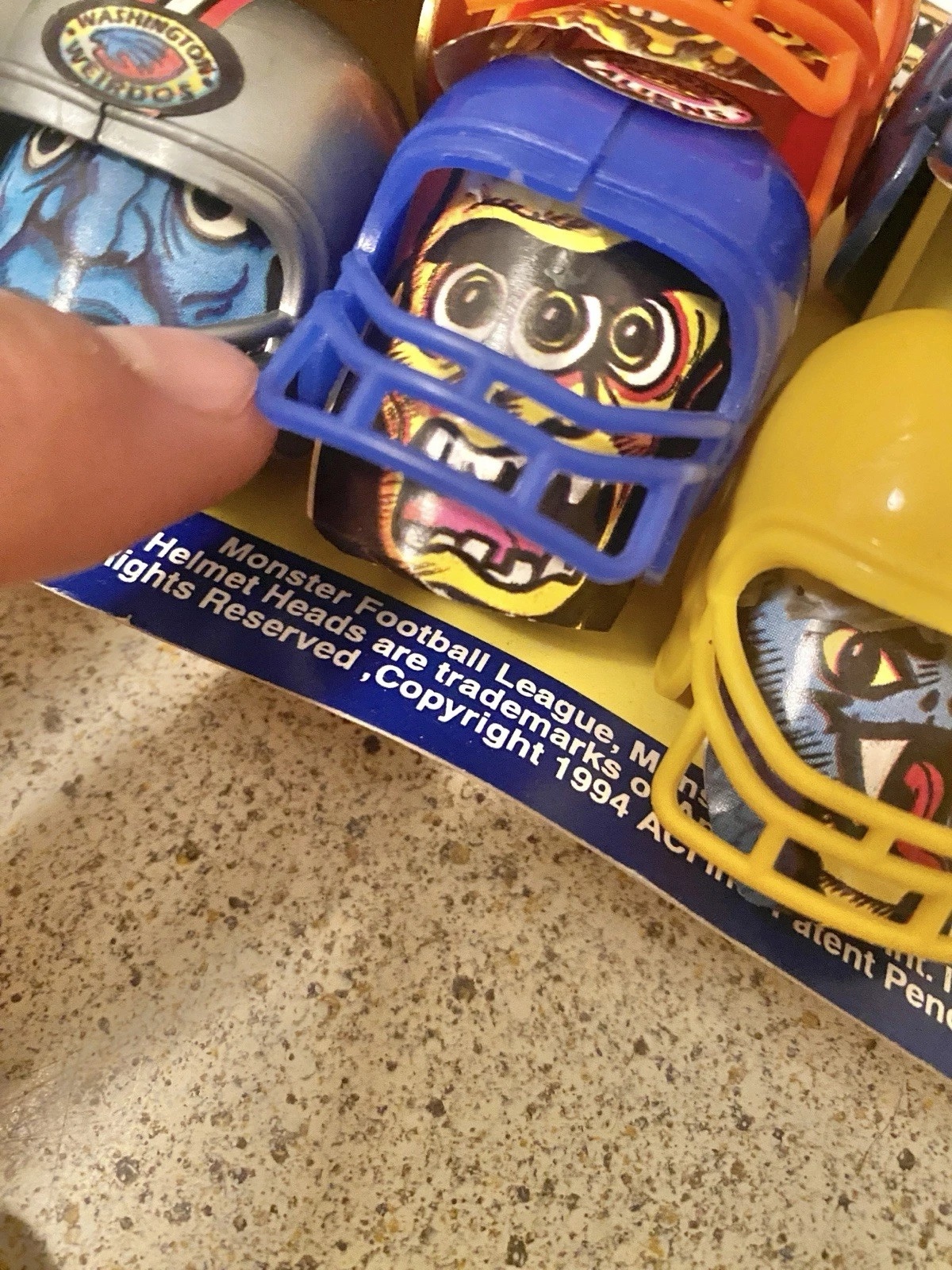 Apparently these were available in gumball machines at some point. Along with the helmets were stickers for teams in a fictional Monster Football League. In addition to the standard side logos and center stripes were faces to be cut out and put inside the helmets. The lot included whole unpeeled sticker blocks for 8 different teams: Oakland One-eyes, Philadelphia Frankensteins, Dallas Demons, Washington Weirdos, Seattle Snakes, Miami Mummies, Pittsburgh Pirahnas [sic], and San Francisco Slimers. Scan of the stickers is first attachment.