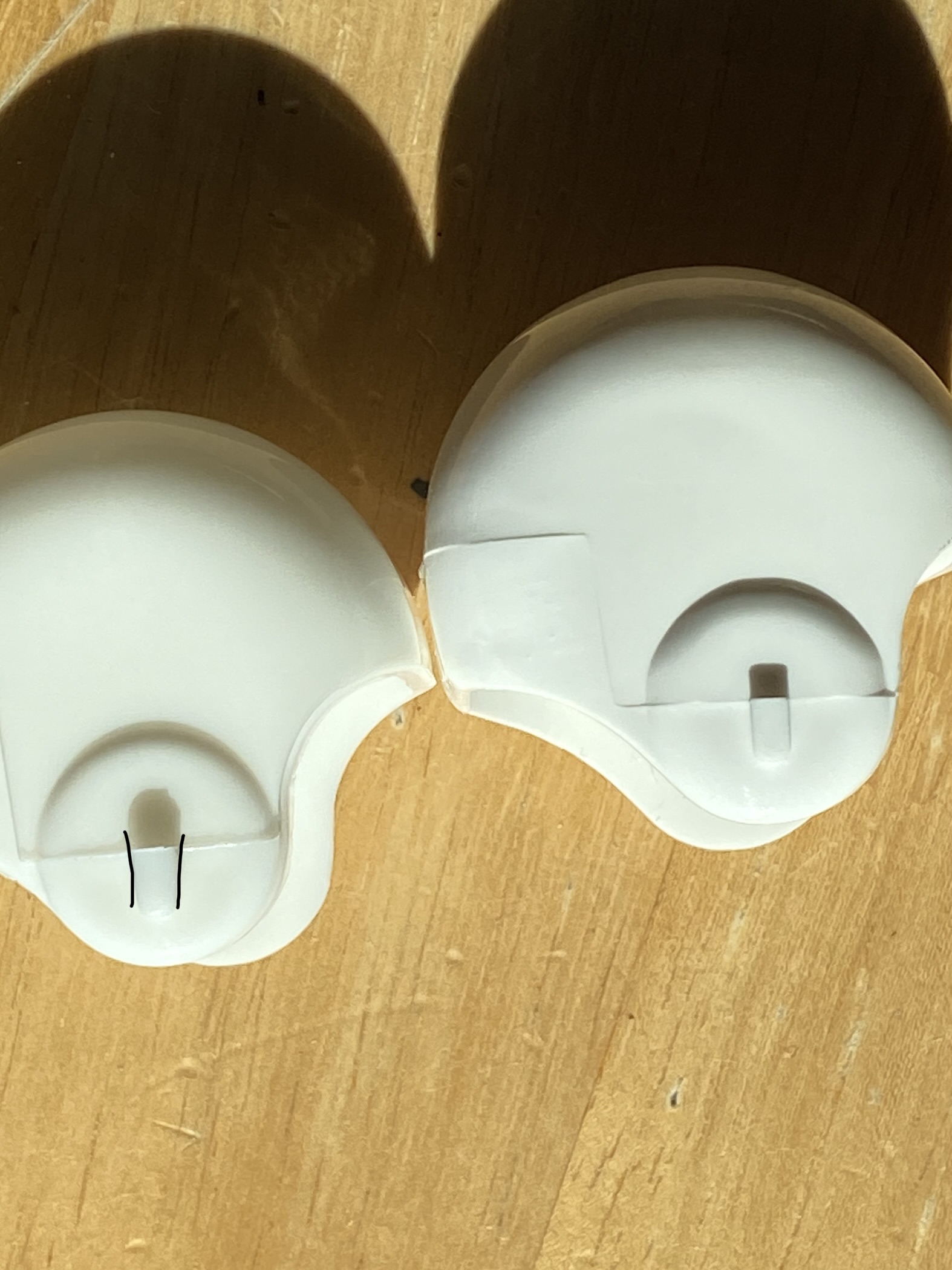 The V2 ear post is in the shape of a wedge that flares out at the top. Compared to the V1 ear post which is straight.